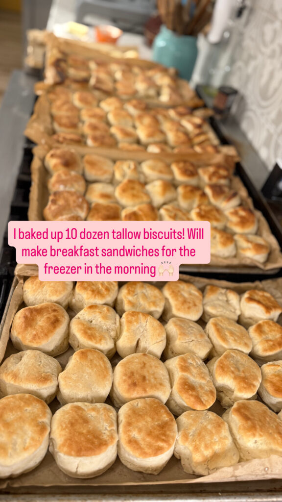 These Massive Large Family Homemade Biscuits are one of my most reliable and well-loved big batch recipes, made dairy-free with tallow! This method makes 10 dozen biscuits (120 total!), perfect for stocking the freezer, feeding a large household, prepping school-year breakfasts, or creating easy grab-and-go options like freezer sausage biscuit sandwiches.