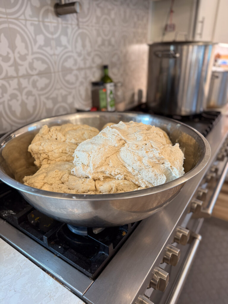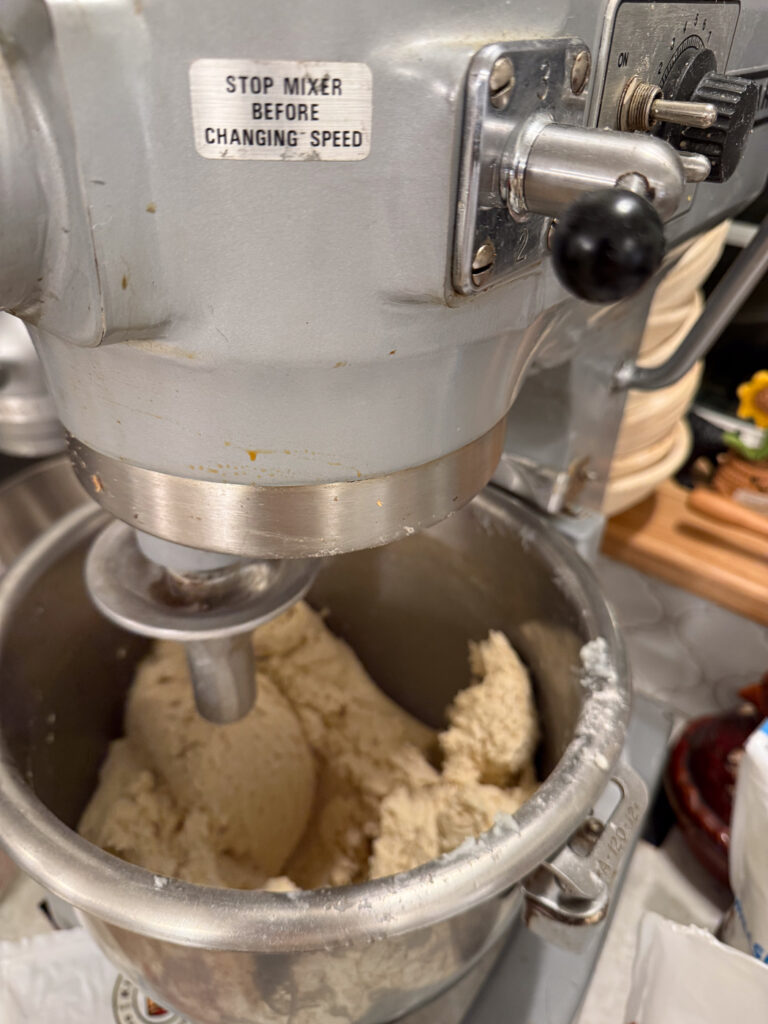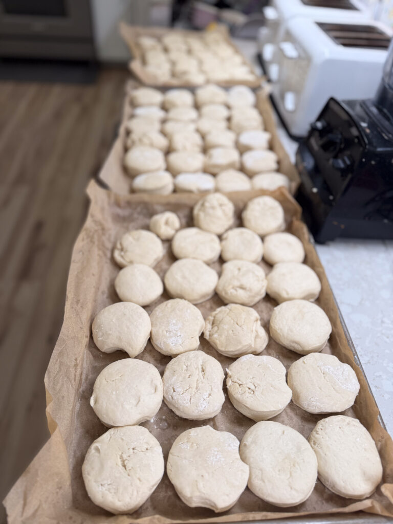 The Hobart handles the full 10 dozen batch with ease. A standard KitchenAid works perfectly by making the dough in 3–4 smaller batches. When using a 6-quart mixer, divide ingredients by 4 to keep the strain on the motor to a minimum. When each batch is complete, add the dough to a mega mama bowl. Once all your dough is done then you can start cutting individual biscuits.
