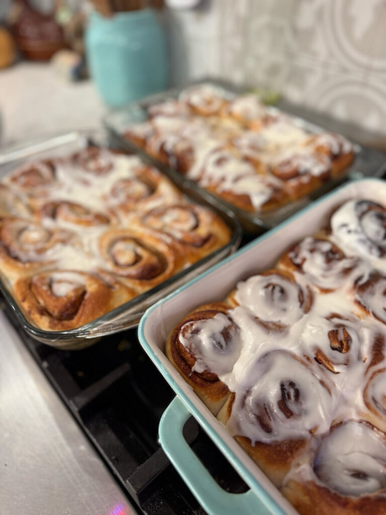 I’m cooking and serving meals from the freezer, and keeping food moving through out the week. We bake 2 dozen homemade salmon cakes from the freezer, meal prep about 8 pounds of broccoli, baking a 10×15 pan of baked spaghetti from the freezer, prepping quinoa in the slow cooker, and making three 9×13 pans of cinnamon rolls, because the fourth burnt. Whoops!