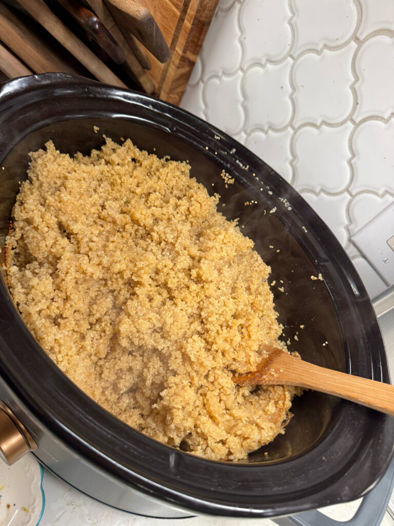 I love doing rice in the slow cooker. For a little extra bonus, I decided to give quinoa a go. I did 4 cups of rinsed quinoa and 8 cups of liquid (we have beef and chicken stock, as well as a bit of water) and this will make about 12 cups total. A little bit of salt, pepper, onion powder, garlic powder, and turmeric add the flavor and we let the slow cooker do all the work for us. I served the quinoa alongside 8 pounds of broccoli, we will use it throughout the week, and salmon cakes. I love that these salmon cakes were prepped ahead in the freezer, so all I had to do was pop them on a sheet pan and into the oven. This made for an easy dinner for my people as I went live with my Large Family Table Community membership people.