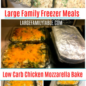 Of course, I love large family freezer cooking and getting a bunch of freezer meals in the freezer for the coming weeks and months! This low carb Chicken Mozzarella Bake is a spin-off of my Chicken, Broccoli, Rice